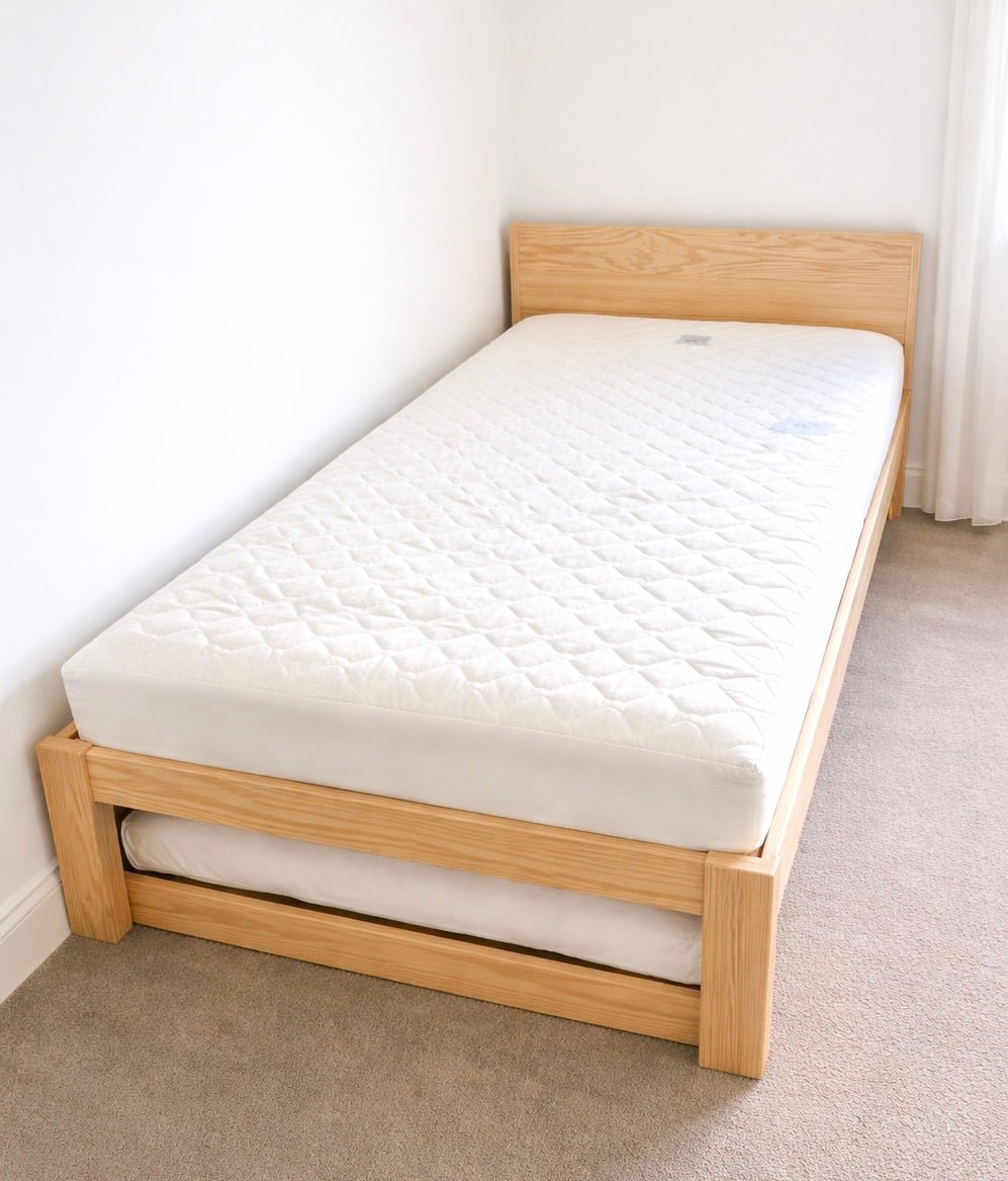 • Organic INNATURE Mattress: Choose between 125mm and 150mm thickness for optimal comfort and support. The 125mm mattress, ideal for those under 60kg, transitions smoothly from a cot to a bed, while the 150mm mattress supports up to 75kg, perfect for teenagers or co-sleeping with a parent.
