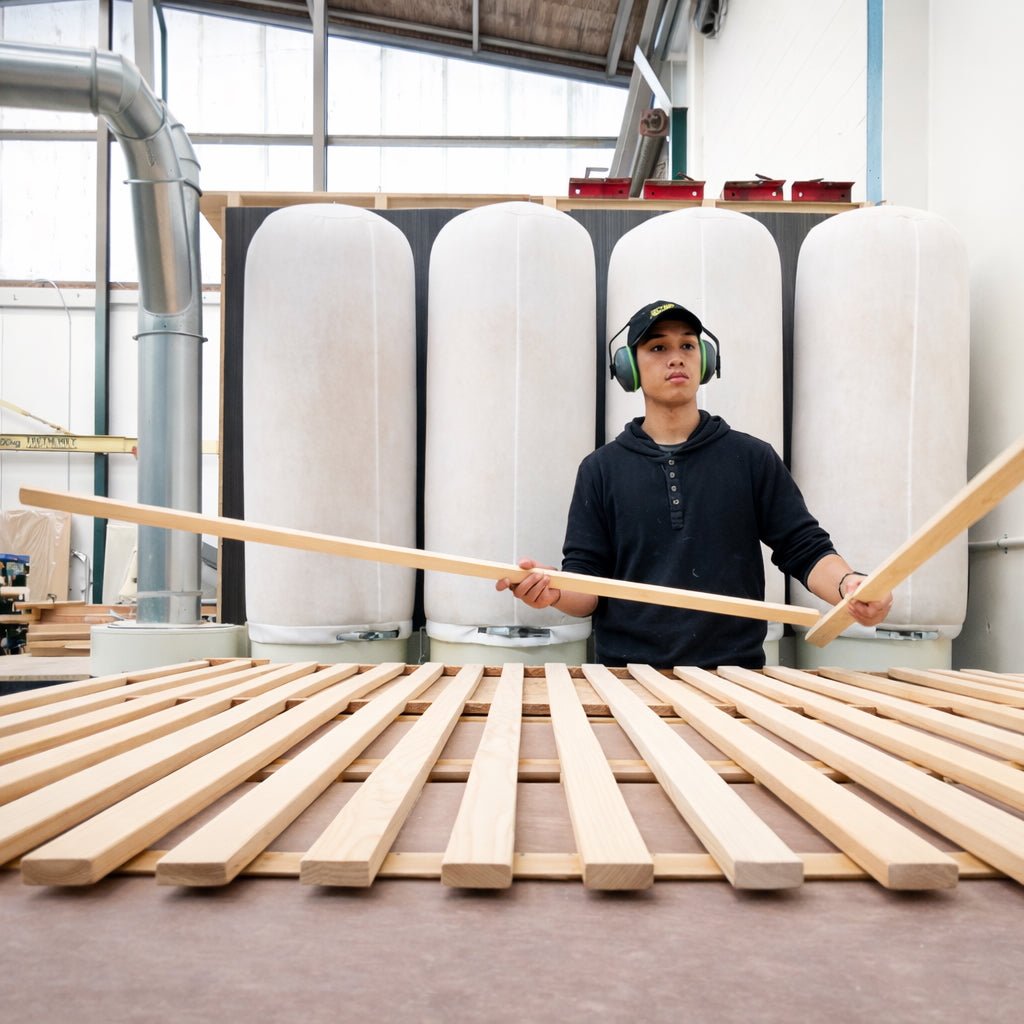 Built with sustainably sourced solid NZ pine, the 'Zen' bed base features robust 32 x 90mm pine rails that deliver exceptional strength and longevity. High-quality, knot-free pine slats with precision-drilled holes sit securely on the rails via durable stainless steel pins, ensuring optimal mattress support and superior air circulation for a healthier sleep environment.